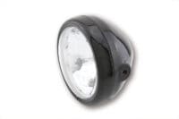 H4 headlight with clear glass in a black metal housing with side mounting points. The headlamp with parking light has an asymmetrical reflector and adjustable inner ring.